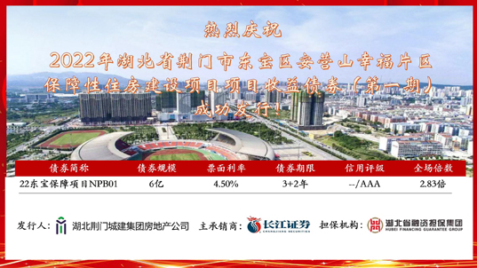 近日,市城控集團所屬城建集團房產(chǎn)公司與長江證券合作,成功發(fā)行2022年湖北省荊門市東寶區(qū)安營山幸福片區(qū)保障性住房建設(shè)項目項目收益?zhèn)ǖ谝黄冢l(fā)行規(guī)模6億元,期限5(3+2)年,全場認購倍數(shù)2.83倍,票面利率4.50%,創(chuàng)下全國中部地區(qū)近5年項目收益?zhèn)泵胬首畹退健?/span>