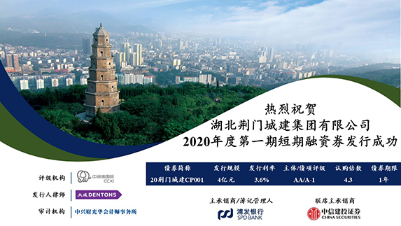 8月20日,市城控集團(tuán)所屬荊門城建集團(tuán)2020年度第一期短期融資券(20荊門城建CP001)成功發(fā)行,發(fā)行規(guī)模4億元,期限1年,票面利率3.6%。該債券為荊門市非金融企業(yè)成功發(fā)行的首單短期融資券,也是近5年發(fā)行利率首破4%的公開市場債券,3.6%的發(fā)行利率創(chuàng)全市近5年來公開發(fā)債市場利率最低。